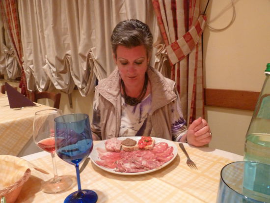 Nach dem Abstieg fahren wir nach Hause, ruhen noch ein Stündchen und gehen dann ins Il Nichio, um Balala a la Vituviana und Osso Buco zu essen. Man erkennt uns erfreut wieder, wir nehmen den gleichen Tisch, aber Ulrike muß umdenken, es gibt kein Osso Buco. Stattdessen wählt sie gallina diabolo.