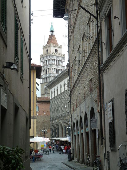 Danach geht es wieder in die Innenstadt, wo heute Markt ist. Daher ist es recht belebt, aber manche Motive werden auch durch Lieferwagen empfindlich beeinträchtigt. Auf der Piazza del Duomo blicken wir zurück auf den Torre di Catilina, links liegt der Palazzo Communale, rechts neben dem Battisterio der Palazzo Pretorio.