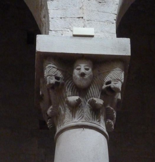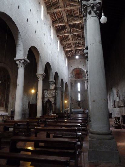 Die Kirche selbst ist romanisch mit einem ganz schmalen Hauptschiff und zwei noch schmäleren Seitenschiffen. Toll ist die Holzdecke - fast kunstvoller als die im Dom. Die Kapitelle sind gut ausgearbeitet und einzelne haben wieder Fratzenköpfe.