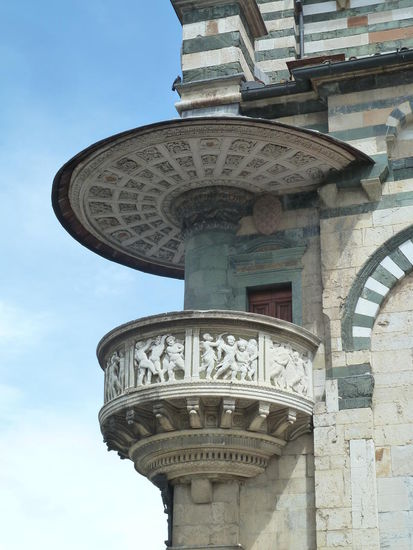 An ihrer rechten Aussenecke befindet sich die geniale Aussenkanzel von Donatello und Michelozzo (1430-1438). Die Aussenkanzel wurde zum öffentlichen Vorzeigen des Gürtels der Madonna geschaffen, die wichtige Reliquie, welche in der Kirche aufbewahrt wird und die noch heute zum Weihnachten, Ostern, am 1. Mai, am 15. August und in besonders feierlicher Form am 8. September, der Geburt Mariens, gezeigt wird. Auf dem gewölbten Bronzekapitell ist eine konzentrische Reihe von Umrahmungen in weissem Marmor, welche den kreisenden Effekt der Kanzel unterstreichen. Ihre Brüstung (das Original wird im Dommuseum aufbewahrt) stellt ein Tempelchen dar, in welchem sich Gruppen von Engeln in lebhaftem Tanz schlingen. Ein eleganter Baldachin in Schirmform krönt die Kanzel.