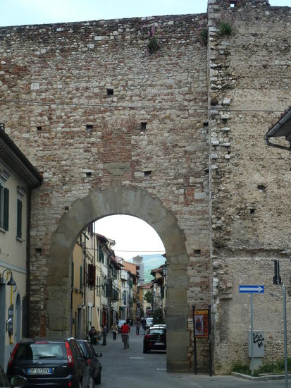 In Prato selbst ist der Teufel los, auf einem riesigen Parkplatz ist nichts zu finden, erst als wir aufgeben wollen, finden wir direkt daneben einen freien Stellplatz. Um eine Bastion der Stadtmauer herum gelangen wir in die Innenstadt.