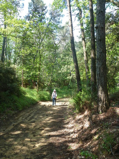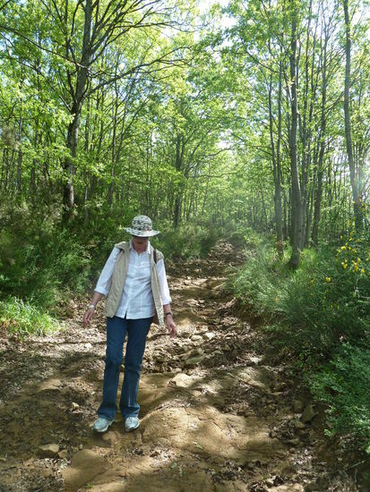 Auf der Normalstrecke wieder angekommen geht es, dem Bergrücken entlang mit herrlichen Ausblicken auf Vinci weiter. An einer Stelle hat man schwer abgeholzt und ein Fahrzeug mit riesigem Reifenprofil hat tiefe Löcher in den Weg gegraben und wir müssen an vielen Stellen 'hüpfen'.