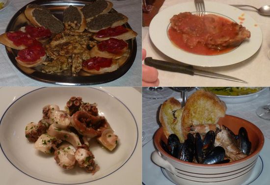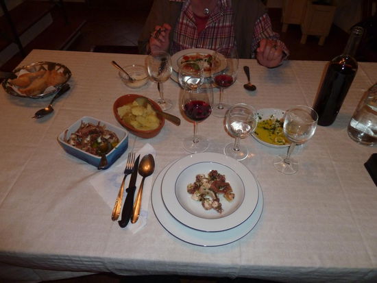 Wir beschließen, den Restnachmittag in der Sonne auf unserer Terrasse zu verbringen. Doch dort liegen wir kaum auf den Liegen, kommen ein paar Tropfen. Doch die Wolke verzieht sich wieder und wir können etwas Sonne genießen. Pünktlich um 19.30 Uhr erscheinen wir bei Susi nebenan und werden wie Familienmitglieder begrüßt. Constanza hat sich (zum Bedienen) ganz chick gemacht; Vater bringt zwei Glas Weißwein und dann fahren sie auf. Für mich Bacala in Öl mit Zitrone, für Ulrike Antipasti (frittierte Artischoken, Toast mit Tomate, Crostini mit einer Art Leberwurstpaté. Danach bekommt Ulrike Pasta und ich Pulpo mit warmen Kartoffelsalat. Und schließlich gibt es als secondi platti Osso buco bzw. eine Fischsuppe (wie Zarzuela). Zum Nachtisch gibt es dann Erdbeertorte - natürlich genauso selbstgemacht wie die beiden hochprozentigen Liköre (Orangen- und Brombeer-), die wir zum Kaffee bekommen.