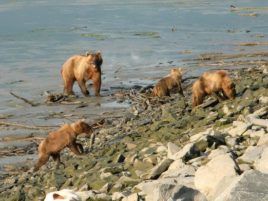Leider muß ich dringend meinen Akku fürs Notebook aufladen, denn die Akkus für die Digitalkamera und die Filmkamera gingen vor. Wir haben Unmengen von Fotos '''machen müssen'''!!! Und gefilmt habe ich fast ständig. Trotzdem blieb Zeit alles mit Muße und nur mit den eigenen Augen zu bestaunen. Die Tiere sind überhaupt nicht menschenscheu und ich konnte mich an den Grizzlys nicht satt sehen und da die Lachse direkt am Ufer laichen kamen heute riesige Seebären o.ä. fast direkt ebenfalls ans Ufer.