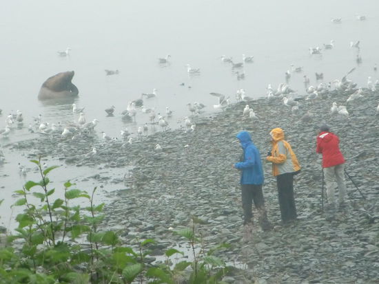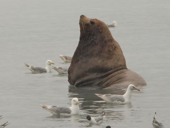 Zur Freude der Möwen kam der Seelöwe immer mit einem lachs an die Wasseroberfläche und schüttelte den Fisch hin und her. Irgendwie bleiben dann Reste zurück auf die sich die Möwen mit lautem Geschrei stürzten!