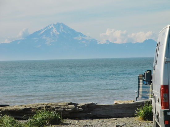 Die Strecke führte dann aber nicht an der Küste direkt entlang, sondern mal wieder hauptsächlich durch Wald. Aber dann kam Ninilchik und dahinter der Campingplatz direkt am Meeresstrand. Und wir bekamen noch einen Platz in vorderster Linie!