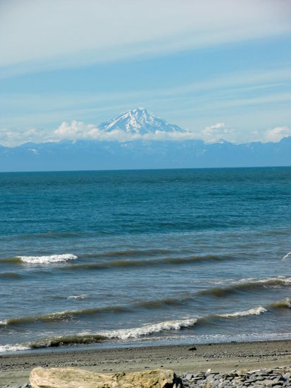 Kenai und im Hintergrund der Mount Spurr, ein langer Lava-Dom. Letzte Eruption 1992 der die Aschewolken bis nach Anchorage trieb.
