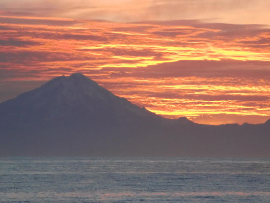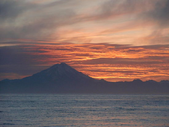 Danach sah ich gleich alle Unterlagen durch; niemand erwähnte die Bergkette auf der anderen Seite der Bucht! Dann entdeckte ich in einer Zeitschrift einen Artikel über die '4 schlafenden Giganten', Vulkane die zum Ring of Fire gehören. Und 'mein Berg' war der Mt. Redoubt, 3108m hoch, der zuletzt 2009 ausgebrochen ist!