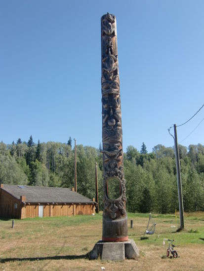 Wir fuhren über Kitwanga zum Indianerdorf Gitanyow und sahen uns die Totempfähle im Dorf an. Schöne Stimmung im Dorf auf einer Wiese wo die Pfähle standen.