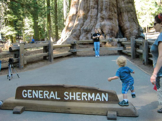 Riesenrummel am größten, d.h.breitesten Stamm, Baum der Welt - der General Sherman. Das war der ganze Sache schon etwas abträglich. Ich fand es schade, daß man am Stamm nicht entlang laufen konnte. Bei den Küstenredwoods gab es keine Begrenzungen; man konnte wie man wollte durch den Wald laufen.