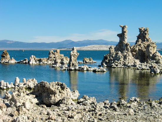 Besonders schön sehen diese Tuffsteingebilde im Zusammenspiel von Wasser und der Wüstenlandschaft im Hintergrund aus.