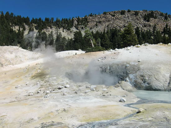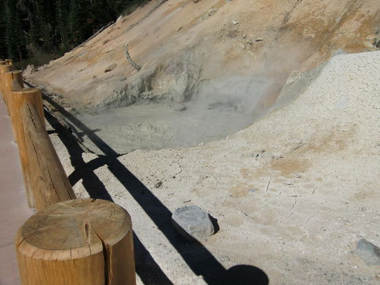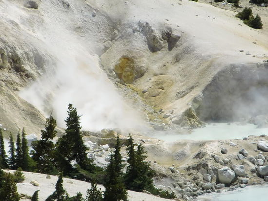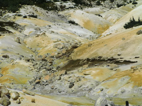 Wir parkten kurz darauf an der Strasse um die Sulphur Works zu besichtigen und fuhren dann weiter zu den Bumpass Hell. Da mußten wir allerdings schon so 20 Minuten durch den Wald einen Pfad entlang laufen um zu den 'Grüßen aus der Tiefe der Erde' zu gelangen!!! Sehr beeindruckend das Ganze!!!