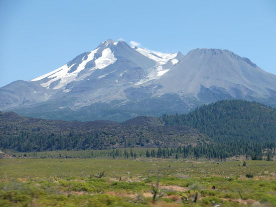 Erster Blick auf den Mount Shasta, einem ganz alleine in der Landschaft stehenden Vulkan! Grandios!