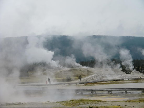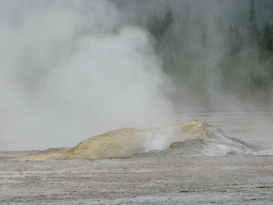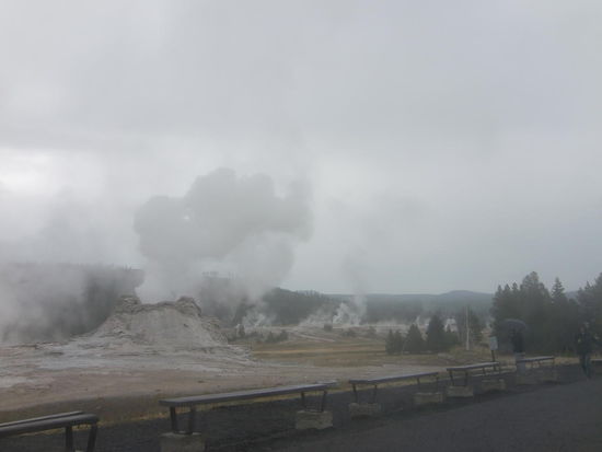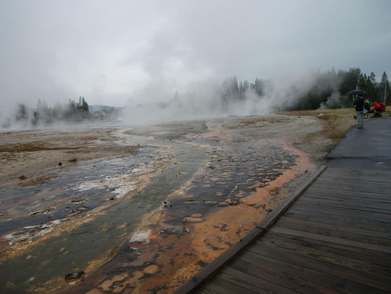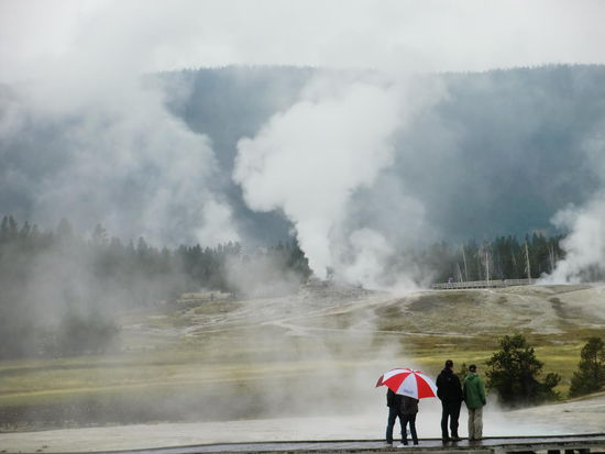 Da fing es dann leider zu regnen an und wir mußten mit dem Regenschirm herumlaufen. Die Sicht war aber gut. Nur hatten wir versehentlich weiter weg vom Visitor Center geparkt und ich hatte mich noch nicht richtig 'regengerecht' angezogen. Dazu hatten wir aber keine Zeit mehr, denn Old Faithful sollte in 15 Minuten ausbrechen!