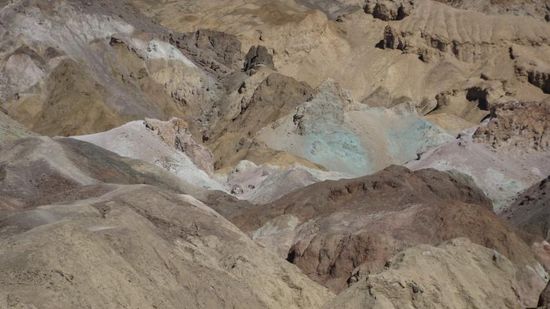 Mit 85,5 m unter dem Meeresspiegel ist dies der tiefste Punkt Nordamerikas und damit auch unserer Reise. Weltweit gibt es noch 4 Punkte die tiefer sind - Spitzenreiter ist das Tote Meer mit ueber400m unter NN - aber die liegen alle auf anderen Kontinenten. Wir machen die hier übliche Salzwanderung, 500m raus und wieder zurück, schauen noch kurz die Felswand hoch zur Meeresspiegelmarkierung und fahren weiter zum Artist's Drive,