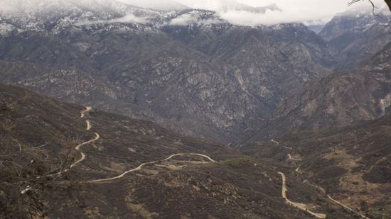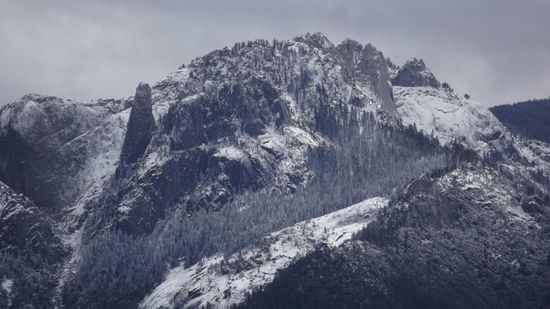 In der Nacht hat es droben auf dem Berg ca. 10cm geschneit und auch für den Nachmittag war 20% Wahrscheinlichkeit für leichten Schneefall angekündigt. Deshalb wurden wir bei der Einfahrt in den Sequoia NP wie alle anderen Autofahrer heute auf des Vorhandensein von Schneeketten überprüft und wer keine vorweisen kann muss entweder ganz draussen bleiben oder mindestens 3 Meilen zurückfahren und dort welche für (bei unserer Reifengröße) $40 mieten. Argumente wie wir fahren nur bis zur Schneegrenze o. ä. halfen nichts, zu steil, zu gefährlich, ist halt einfach Vorschrift. Wir mieten uns also ein paar Ketten und fahren den Berg hoch. Ein erstes Foto am Tunnel Rock,