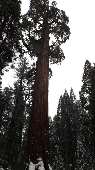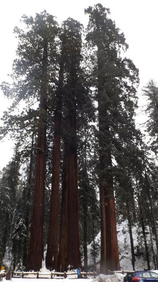 bei etwa 1600m erste Spuren vom Schnee am Strassenrand und ab etwa 2000m Tauwetter, perfekt geräumte Strassen und Parkplätze, der einzige Schnee auf der Strasse waren kleine Häufchen, die von den Zweigen der Bäumen gefallen waren. Einzig die Trails waren gespurte Pfade im Schnee, aber völlig problemlos zu begehen. Wir statten dem General Sherman Tree, dem volumensmäßig größten Baum der Welt