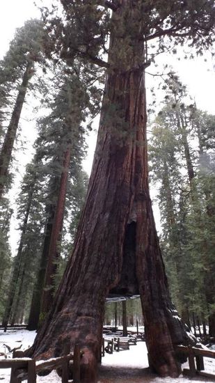 Da der Park selbst zumindest im unteren Teil schneefrei ist, fahren wir vom Süden kommend erst einmal in die Mariposa Grove, Im Sommer wird man hier per Shuttlebähnchen von einem Sequoia Baum zum nächsten gekarrt, jetzt im Winter hat man die Gelegenheit im Schnee durch den Park zu stapfen. Wir gehen am Junggesellen mit den drei Grazien vorbei,