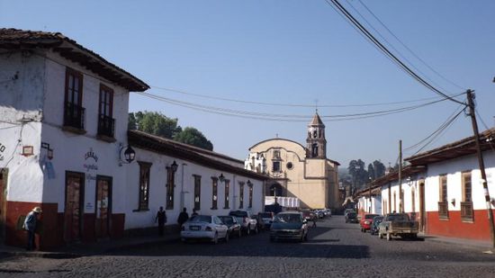und steigen eben die150 Hm zu Fuss nach oben. Droben beim Auto treffen wir auf ein Schweizer Camper-Pärchen, das soeben hellauf begeistert vom 7 stündigen Ausritt zum Kraterrand zurückkommt. Wir tauschen noch für eine Weile Erlebnisse und Erfahrungen aus, bevor wir uns wieder auf den Weg machen. In Angahuan schauen wir uns noch kurz die Kirche an,