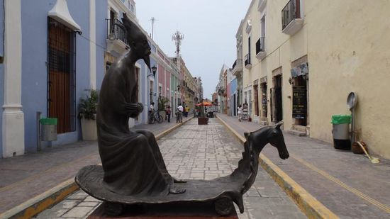Campeche, ist laut Reiseführer die Stadt mit den freundlichsten Leuten Mexicos - wir müssen sagen: stimmt. In Seybaplaya stehen wir dumm auf dem Fischmarkt herum und schauen uns die Gegend an, schon kommt Hektor, stellt sich vor und fragt was wir suchen würden, ob er uns helfen kann!!! Kaum haben wir im Feiertagstrubel (1. Mai) in Campeche einen Parkplatz gefunden, kommt schon eine Mexikanerin und fragt im besten Englisch ob wir uns in dem Baustellenverkehr verfahren hätten, ob uns ihr Mann herauspilotieren soll??? Nein, wir sind doch froh, endlich nahe der Innenstadt zu sein, einer Altstadt, die an allen Ecken und Enden renoviert, verschönert wird und die uns vom ersten Augenblick an gefällt. Sei es diese Skulpturenpark-Fußgängerstrasse,