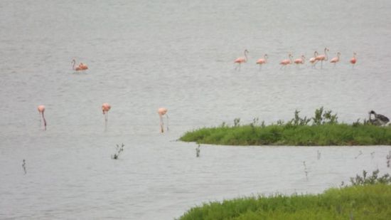 dann auf dem weiteren Weg entlang der sich fast völlig in Privatbesitz befindlichen Strände sehen wir den Flamingos beim Frühstücken zu,