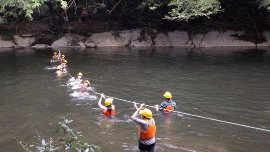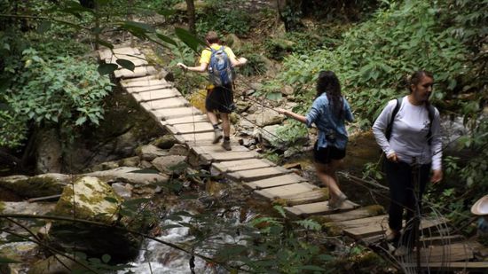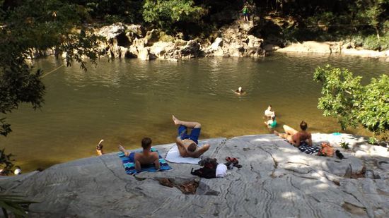 und auch die Cabanas hier einen sehr ordentlichen Eindruck machen. Zur Einstimmung machen wir erst einmal die etwa 40 minutige Wanderung den Fluss entlang, die uns zu den Attraktionen wie der 8m hohe Plattform zum ins Wasserspringen,