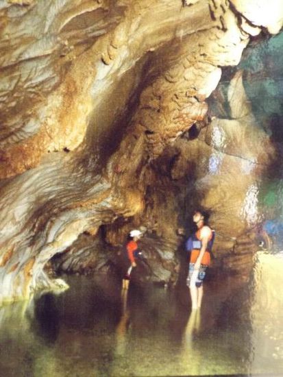 Noch weitere 40 Minuten durch den Urwald, erst bergauf mit Tarantel-sichtung, dann steil bergab, bis wir am Eingang der Höhle stehen. Drinnen in der Höhle, eher ein unterirdischer Fluss mit herrlichen Auswaschungen, mal enger und bis zu brusttief,