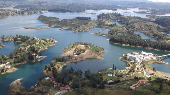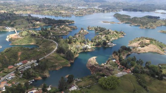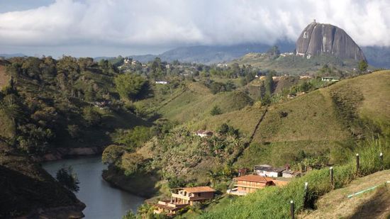 dessen Kraftwerke am Staudamm 65% des Stroms Kolumbiens produzieren. Hier ragt Penon de Guatape, ein 230m hoher Monolith aus der Landschaft,
