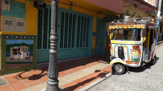 Nichts anderes zu tun, also gehen wir halt eine Stunde lang zu Fuss zurück nach Guatape um noch mehr dieser Zocalos zu fotografieren. Mal hat einer sein Taxi an der Hauswand verewigt,