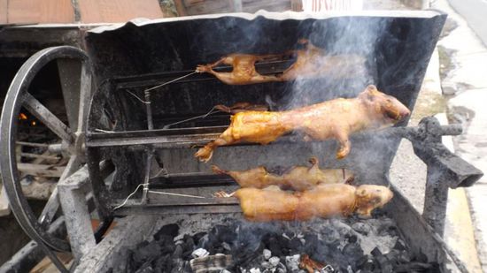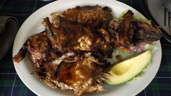 und nachdem wir ja gestern gelernt haben, dass diese ecuadorianische Delikatesse auch beim 'letzten Abendmahl' serviert wurde, wollen wir uns dies natürlich nicht entgehen lassen, also rein ins Lokal und Cuyes Asado bestellt.