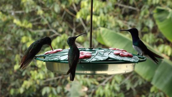 Um den ganzen Trail abzuwandern muss man mit 4-6 Stunden rechnen, da vom Hauptweg 5 sogenannte Loops/Schleifen abzweigen, die auf Schulterbreiten Pfaden durch naturbelassenen Nebelwald führen. Da wir relativ spät aufgebrochen sind, müssen wir unsere Wanderung wegen einsetzender Dämmerung nach Loop 4 leider abbrechen. So haben wir in 3 Stunden 250Hm zurückgelegt, die Natur und die reine Luft genossen. Am nächsten Morgen wollen wir eigentlich gleich weiter bis ans Meer, aber unsere netten Gastgeberinnen laden uns erst mal auf ein Glas Fruchtsaft auf Ihre Terrasse zur Kolibribeobachtung ein. Hunderte dieser kleinen, bunten Vögel schwirren durch den tropischen Garten,
