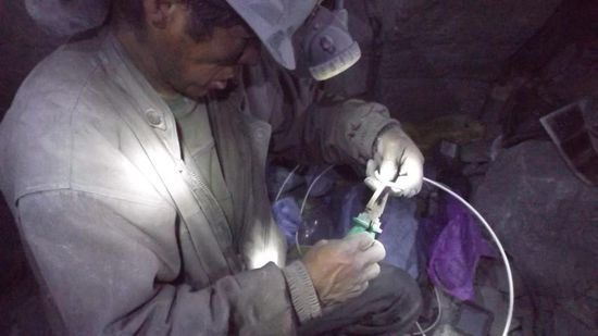 Tief drinnen im Berg treffen wir auf einen Miner, der zusammen mit seinem Sohn eine Sprengung vorbereitet. Wir sehen ihm eine Weile bei den Vorbereitungen zu,