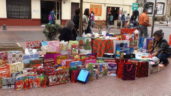 Gut 100 Frauen und Männer sitzen hier rum, ausgestattet mit Geschenkpapier, Tüten, Klebstoff, Bändern und Scheren und warten nur auf den nächsten, der mangels Zeit oder können seine Geschenke verpacken lassen möchte. Noch einige km weiter in Ovalle ist dann Schluss für heute.