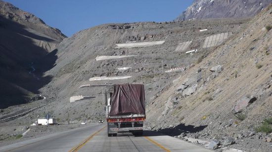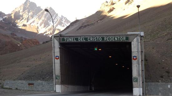 Mitten im Tunnel eine etwa 20m breite rote Markierung auf der Strasse, der Belag wird sofort schlechter, wir sind zurück in Argentinien.