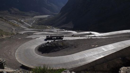 Droben am Berg erst die chilenische Grenzstation, dann auf 3185m der Tunel del Cristo Redentor