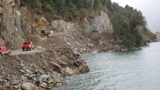 genauso wie alte Holzbohlenkonstruktionen und der Strassenbelag bot alles von bestem 2-spurigen Asphalt über Schotterpisten, Lehmpisten, km-lange Baustellenpassagen bis zu 3m breiten, aus dem Berghang gekratzten Fahrbahnen, an deren Verbreiterung derzeit zumindest teilweise auch schon gearbeitet wird. In ein paar Jahren, wenn der Ausbau einmal abgeschlossen sein sollte, wird diese Strasse sicher unter die Traumstrassen aufgenommen werden, denn die Aussichten hier sind fantastisch. Grün-blaues Eiswasser im Fluss, die Berge, die Gletscher, die NP's im Hintergrund.