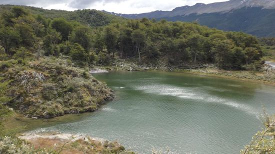 ein Zug, der eher an eine Spielzeugeisenbahn erinnert und der zahlungskräftige Passagiere für ab ARS 400 etwa 5km weit zur Endstation in den NP Tierra del Fuego schafft. Wir fahren dahin lieber mit dem Auto, bezahlen ARS140 pP für den Eintritt in den NP. Ein erster Fotostopp an der Laguna Verde