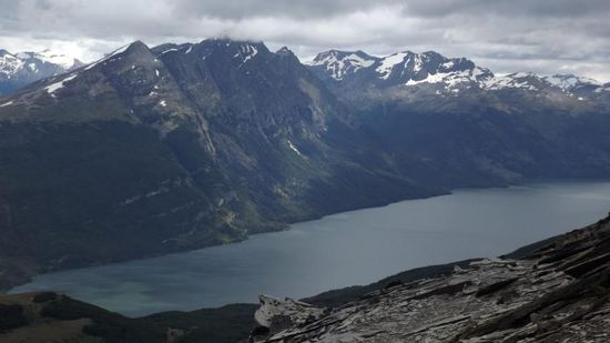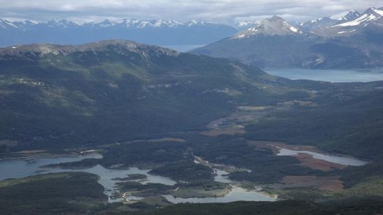 und dann zum Wander Parkplatz am Lago Roca, dem Ausgangspunkt für den Cerro Guanaco Trail. Hier kann man auf einer etwa 5km langen Wanderung in angeblich 4 Stunden (einfach) stolze 1000Hm zurücklegen, ist doch genau das Richtige für uns. Wir machen uns an den Aufstieg, wandern drunten auf Meereshöhe durch flechtenbehangenen Hoch-(Ur-)wald, werfen von unterwegs einen Blick auf den Lago Roca, der von der Grenze zwischen Argentinien und Chile durchquert wird,