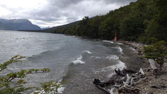 selber schuld, wenn der sich nichts mitbringt und steigen auf demselben Weg wieder ab zum Lago Roca. Hier stossen wir auf den .Hito XXIV Trail, der den See entlang in einer Stunde bis zur argentinisch-chilenischen Grenze führt. 16h, der Nachmittag ist noch jung, das Stück nehmen wir noch mit, sehen nach einer Stunde diesen rostroten Eisenturm am Wasser stehen