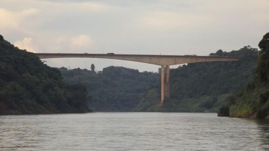 Da wollen wir doch sowieso hin, die Abfertigung in Paraguay dauert keine 5 Minuten, vom Boot aus ein Blick hoch zur Brücke der Freundschaft, auf der der Verkehr immer noch steht