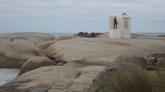 Wir wechseln von der Strassenseite mit Namen Uruguayana auf die mit dem Namen Brasilia, wechseln damit von Chui nach Chuy, sind in Uruguay. Am südlichen Ende der Stadt die uruguayische Grenzstation, an der Migration die Einreisestempel in die Pässe, am Zoll das Autoeinfuhrpapier ausgedruckt und unterschrieben und schon sind wir wieder auf dem Weg nach Süden. Punta del Diablo, eigentlich ein netter Strand/Partyort wirkt verlassen, das Denkmal für die Kriegshelden deplatziert