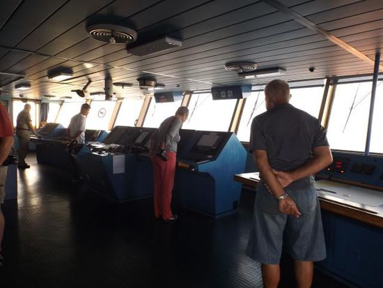 In ein paar Tagen (6-9, je nach Wetterlage, Wind und Strömung) werden wir dann Dakar im Senegal (Afrika) erreichen. Damit uns die Zeit nicht zu lang wird, lädt uns der Kapitän schon mal ein die Brücke zu besichtigen,