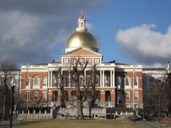 Wohnhäuser und Gedächtniskirchen. Am Anfang des Pfades, am Boston Common ,das State House (Capitol)