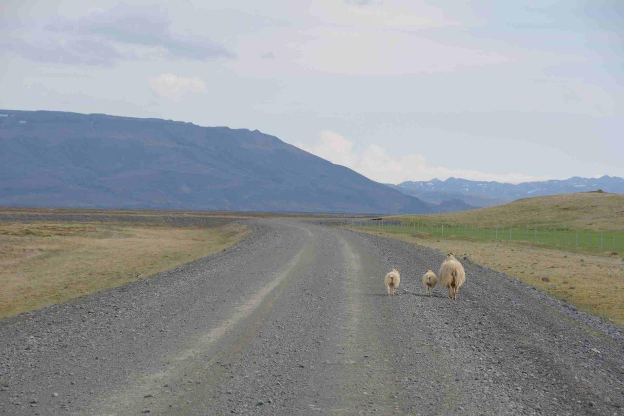 Auf unserem Weg Richtung Skógarfoss liegen nördlich der Ringstraße Berge und Gletscher, im Süden erstrecken sich die saftig grünen Wiesen bis an den Atklantik