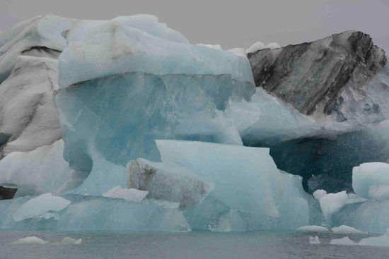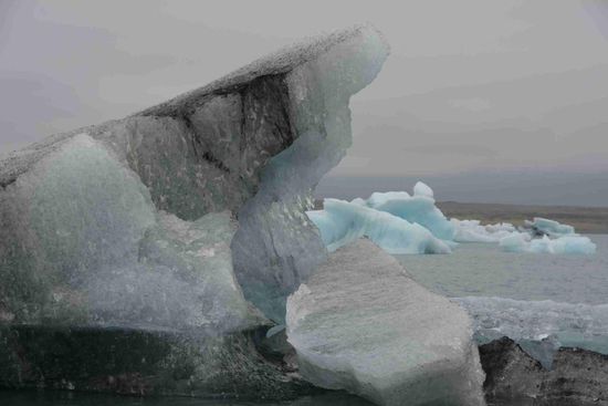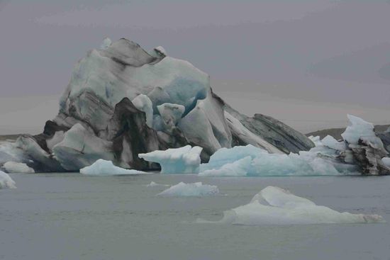 Vor uns liegen ca. 200 - 300 km recht langweiliger Strecke bis zu unserem ursprünglich geplanten Wendepunkt der Reise, der Gletscherlagune Jökulsárlón. Unterwegs liegt auch noch der Nationalpark Skaftafell. An eine Fahrt gegen den Sturm ist aber nicht zu denken. Deswegen entschließen wir uns, mit dem Linienbus nach Jökulsárlón zu fahren, um diesen einzigartigen Ort nicht zu verpassen. Kaum sind wir aus Vík heraus, hört der Regen auf und bei dem Zwischenstopp im Nationalpark Skaftafell zeigen sich die Berge und Gletscher in herrlichem Sonnenschein. Für eine Wanderung reicht die Zeit aber nicht mehr (und damit bekommt der Svartifoss keine Chance, den Seljalandsfoss von der Spitze der Favoritenliste zu verdrängen) und wir setzen die Fahrt bis Jökulsárlón fort. Nur der Strand und die Ringstraße trennen die Gletscherlagune Jökulsárlón vom Atlantik, mit dem sie durch einen kurzen Flusslauf verbunden ist, der mit den Gezeiten seine Richtung ändert und Salzwasser in die Lagune bringt. Dieses ist auch der Grund, dass der Vatnajökul, der größte Gletscher Europas, an dieser Stelle unterhöhlt wird und laufend Eisberge in den See kalben - ein unvergesslicher Anblick. Natürlich unternehmen wir eine Fahrt mit einem Amphibienfahrzeug in die Lagune und probieren das ca. 1000jährige Gletschereis.