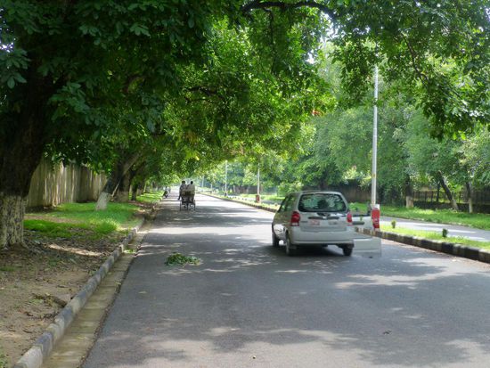 Der Zug bringt uns nun 3 ½ Stunden nach Chandigarh, der Hauptstadt der Bundesstaaten Punjab und Haryana, ist aber selbst ein Unionsterritorium. Sie wurde erst 1947 gegründet, als die ehemalige Hauptstadt des Punjab, Lahore, an Pakistan fiel. Sie ist auch anders als Indien, die Straßen sind rechtwinklig, die Stadt in 29 Sectors unterteilt. Riesige breite Allen, z. T mit Fahrradwegen durschneiden die Stadt, die Entfernungen sind immens. Es gibt sehr viel Grünflächen. Die Stadtplanung wurde von Le Corbusier durchgeführt, auch viele (hässliche graue Betonklotz-)Gebäude sind von ihm entworfen, die sich in der indischen Sonne maßlos aufheizen und ohne Klimaanlagen nicht zu bewohnen sind.