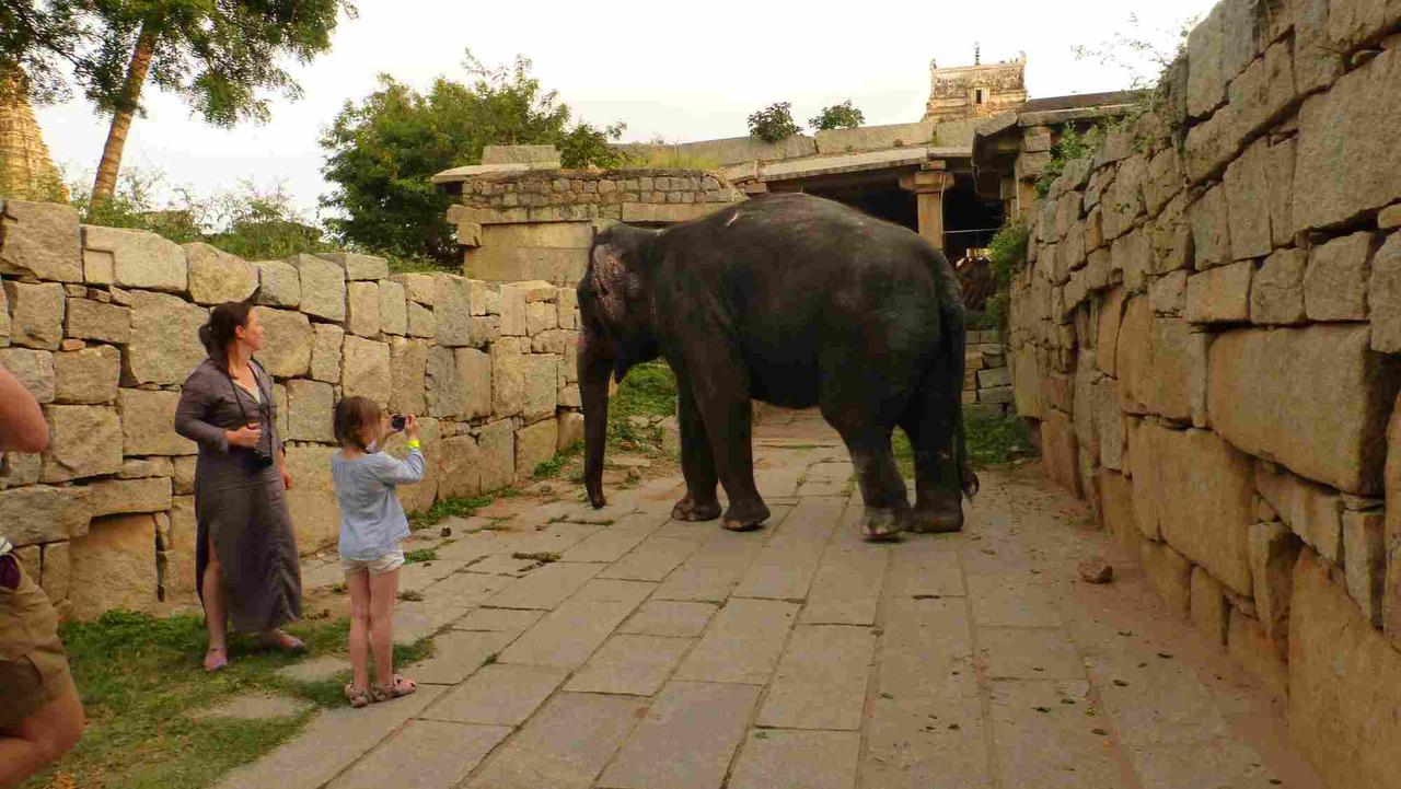 Ein erster Spaziergang führt zum großen Virupaksha-Tempel, dessen 50m hoher Gopuram das Dorf überragt. Hier residiert auch die Elefantendame Lakshmi, die einem gegen geringe Gebühr segnend den Rüssel auf den Kopf legt.