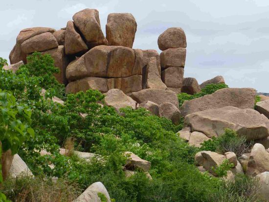 Die unwirtlich verlassenen Ruinen von Hampi stehen in einer geradezu überirdischen Landschaft, die einen sofort in ihren Bann zieht. Haufen riesiger Felsblöcke, die jeden Moment herunterzufallen drohen, erstrecken sich über viele Kilometer welligen Geländes, dazwischen bilden jadegrüne Palmenhaine, Bananenplantagen und giftgrüne Reisfelder einen Kontrast zu den rostig erscheinenden Felskugeln.
