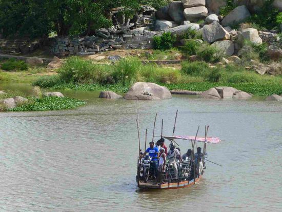 Das kleine Boot mit dem Außenborder legt am Ufer an, es gibt keine Rampe oder so, mit großem Palaver werden 7 schwere Motorräder in das Boot gehoben und dort miteinander verschachtelt.dann steigen noch 10 Leute mit Gepäck zu und tatsächlich passen auch noch unsere Räder irgendwie drauf. Unsere Beine stecken irgendwie zwischen Motorradreifen und heißen Auspüffen. Das Freibord liegt nur noch bei wenigen Zentimetern. Und so geht's dann über den Fluss zurück nach Hampi, wo dann alles wieder "entschachtelt" wird! Der Weg zurück ist dann eher ein Fußweg mit Treppen und Absätzen und ein netter Inder trägt Moanas Fahrrad die ganze Zeit darüber.