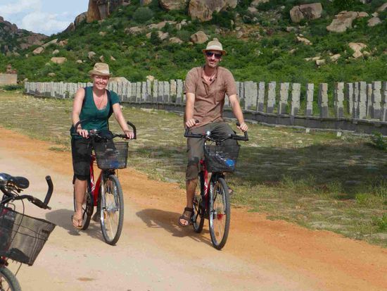 Am nächsten Tag mieten wir Fahrräder, setzen spektakulär mit einen winzigen Bötchen über den Fluss, erklimmen mit 570 Stufen den Hanumantempel (Hanuman ist der Affengott, daher sind viele Tempel auch von Affenherden bevölkert, das sie als heilig gelten), fahren ins Dorf Anegundi und setzen dort noch spektakulärer über den Fluss zurück.
